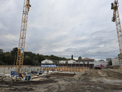 31.05.2014 - Auf dem ehemaligen Gelände der "GESCHI-Brotfabrik" steht die Außenwand des Erweiterungsbaus der Kita bereits.